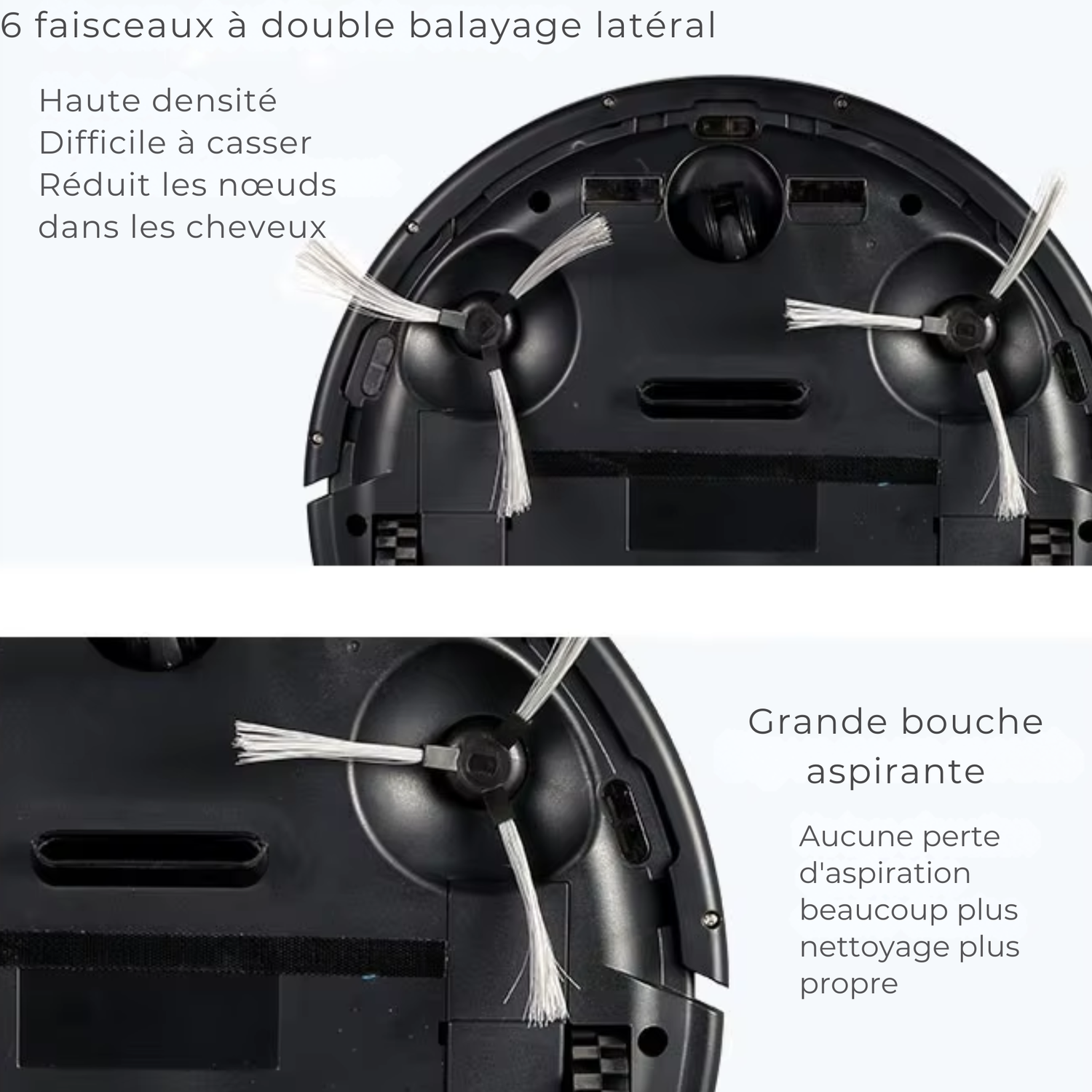• Double brosses latérales à 6 faisceaux pour attraper poussières, poils et miettes.